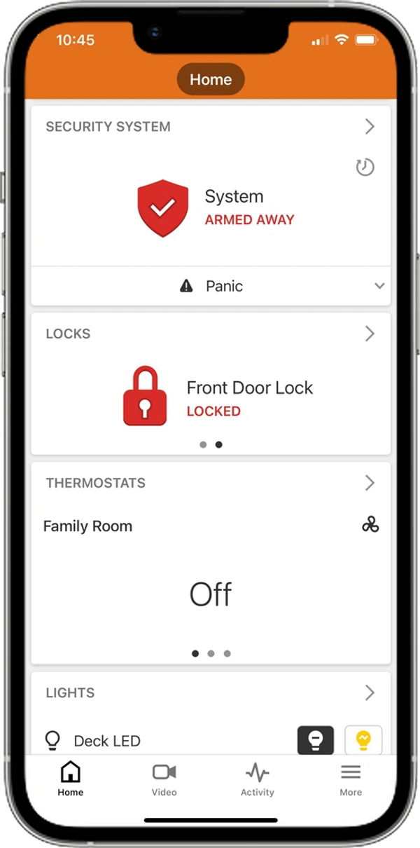 Enable automatic rules and alerts based on your phone’s location through Geo-Services. Be alerted if you’ve left home without arming your system, pause video recordings for privacy, and have your thermostat adjust when you’re approaching home.